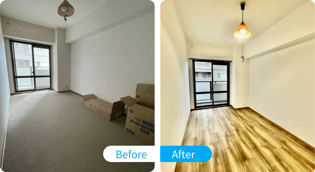 床は総貼り替え、風呂も全てリフォームというのが他社の施工内容でしたが、使える部分は使ってキレイにする方法を打診いただけました。 他に予算も割け、フローリングは選択肢も拡がりました。メールのレスポンスも早く、現調の時も分かりやすく、質問や相談もしやすかったです。気になったのは、後から納品した建具の搬入がスムーズでなかった点。